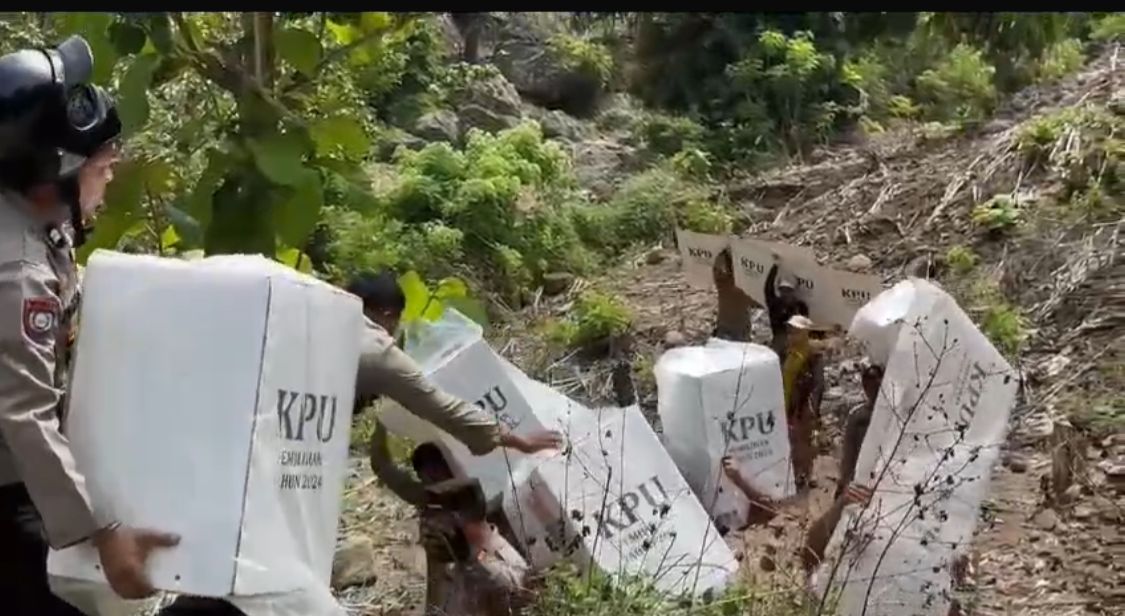 Bima, NTB (27/11) – Logistik Pemilihan Kepala Daerah (Pilkada) Serentak 2024 telah tiba dengan aman di Desa Tarlawi, Kecamatan Wawo, Kabupaten Bima, Selasa (26/11/2024). Distribusi kotak suara melalui jalur pegunungan yang sulit ditempuh mendapat pengawalan ketat dari sinergi TNI-Polri, yaitu Polsek Wawo, Koramil 1608-06/Wawo, dan didukung Satpol PP Kecamatan Wawo.
