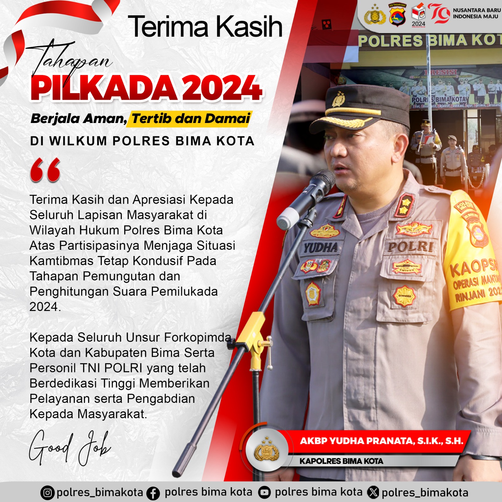 Kapolres Bima Kota, AKBP Yudha Pranata, S.I.K., S.H., mengucapkan terima kasih dan apresiasi yang sebesar-besarnya kepada seluruh lapisan masyarakat di wilayah hukum Polres Bima Kota atas partisipasi aktifnya dalam menciptakan keamanan dan ketertiban masyarakat (Kamtibmas) selama tahapan penting Pilkada ini.