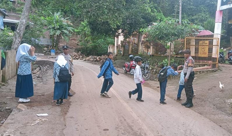 Selain mengatur lalulintas petugas juga membantu menyebrangi anak sekolah yang hendak masuk ke sekolah SMPN I Donggo yang berlokasi di Desa O,o Kecamatan Donggo Kabupaten.