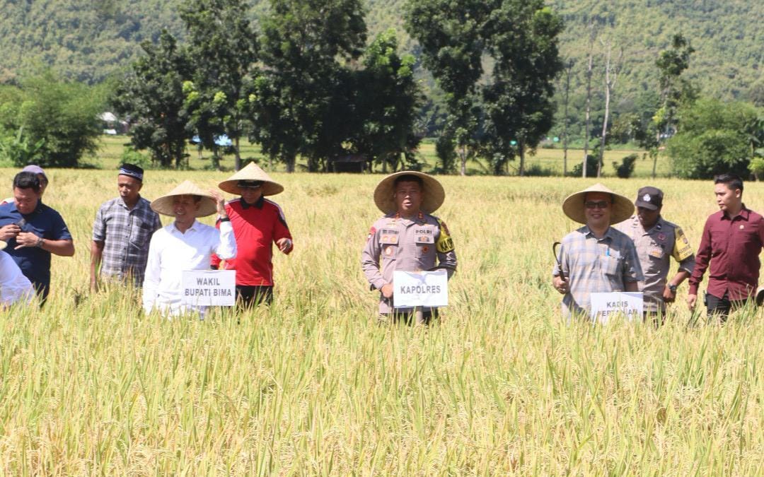 Dalam kegiatan tersebut Kapolres Bima AKBP Eko Sutomo S.I.K.,M.I.K., bersama Bupati Bima Ady Mahyudi terjun langsung bersama petani melakukan pemanenan.
