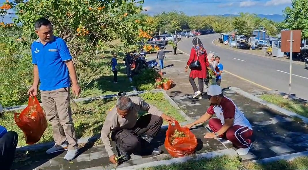 Gotong royong membersihkan sampah yang berserakan di pinggir jalan itu di mulai dari Batas Kota hingga sepanjang jalan taman Panda Desa Kalaki.