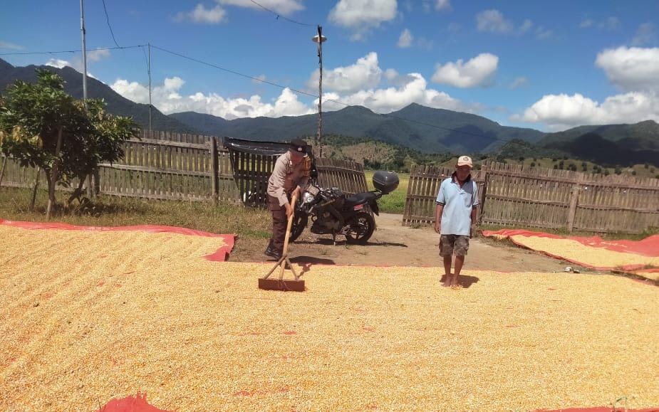 Seperti halnya yang dilakukan oleh Bhabinkamtibmas Polsek Woha Bripka I Wayan Parwata membantu proses penjemuran jagung milik warga binaan di Desa Risa Kecamatan Woha Kabupaten Bima Rabu (16/4/25) siang kemarin.