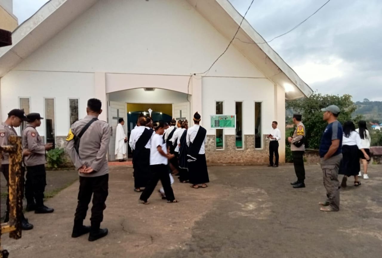 Sejumlah personel yang dikendalikan oleh Kapolseknya AKP Nazaruddin melaksanakan pengamanan disekitar area Gereja.