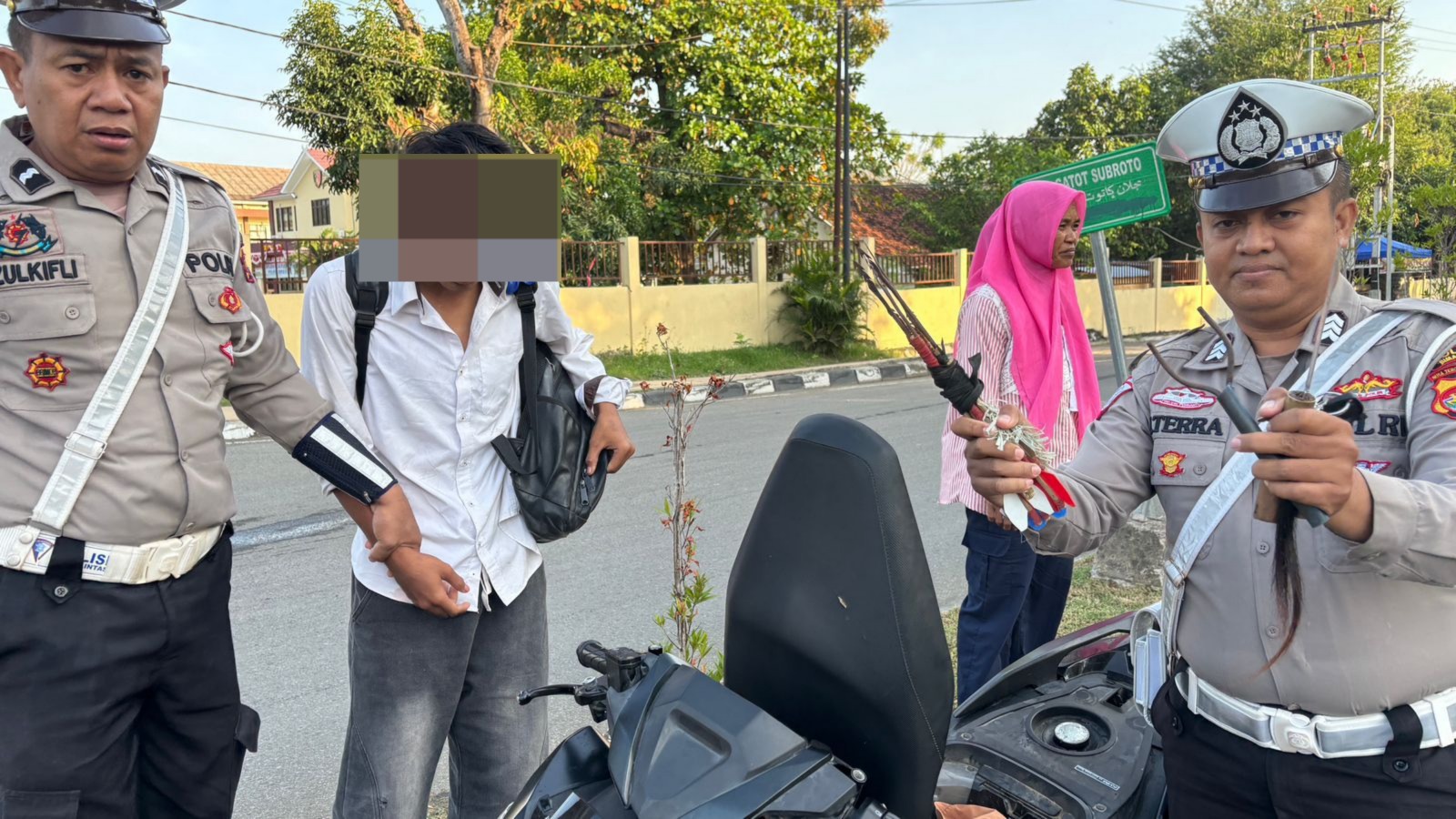 Kota Bima, NTB (27 September 2025) – Personel Satuan Lalu Lintas (Satlantas) Polres Bima Kota berhasil mengamankan seorang pengendara sepeda motor yang kedapatan membawa panah dan senjata tajam (sajam) saat melaksanakan kegiatan Rawan Pagi di kawasan Lampu Merah Simpang Empat Gunung Dua, Kota Bima, pada Sabtu (27/9/2025) sekitar pukul 07.15 Wita.
