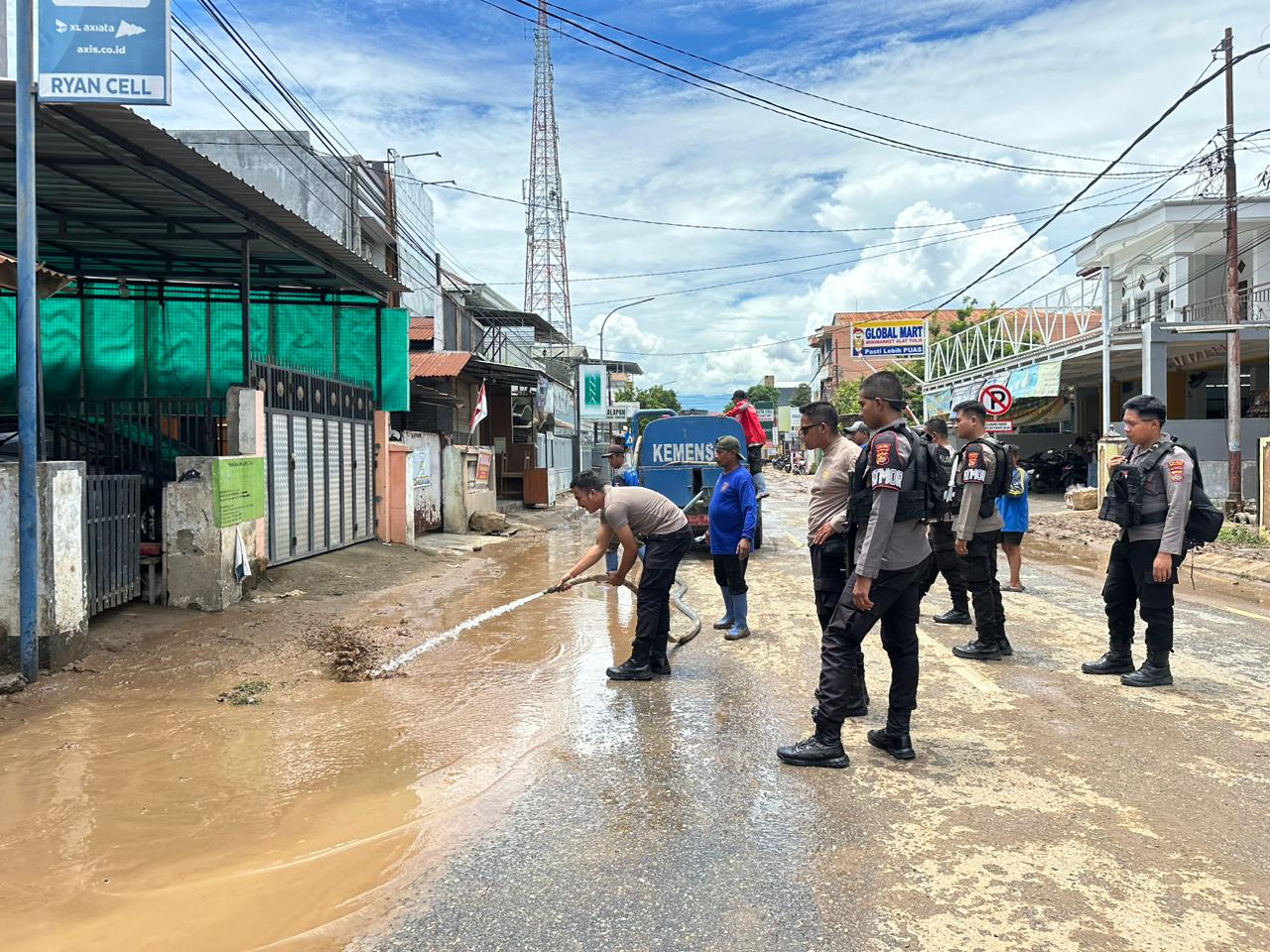 Selain membersihkan jalan yang dipenuhi lumpur, personel juga membantu warga mengevakuasi sisa-sisa material yang terbawa arus banjir. Kegiatan ini dilakukan untuk memastikan mobilitas warga kembali lancar dan lingkungan sekitar aman serta bersih.